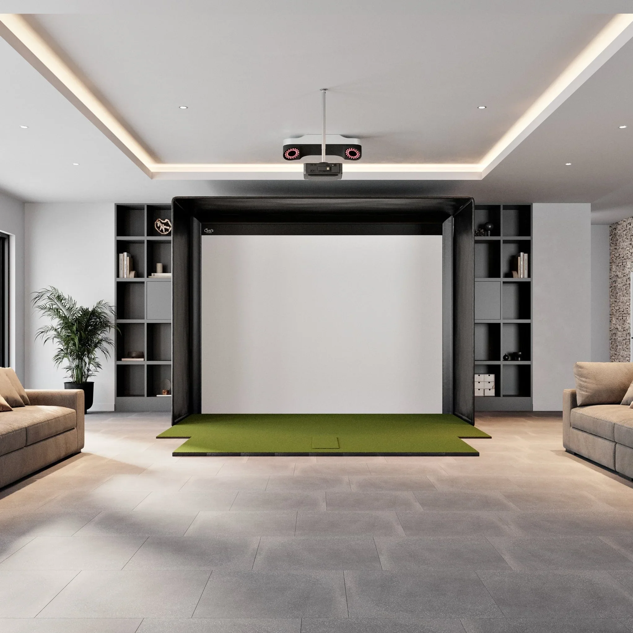 Ceiling-mounted, AI-powered launch monitor with high-speed dual-camera tracking — built for serious indoor golf.